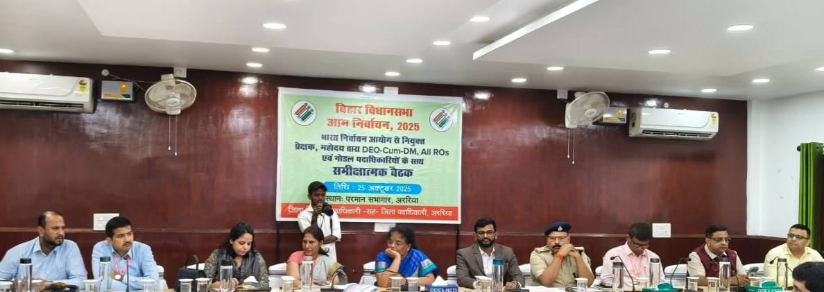 ارریہ :بہار کے ارریہ ضلع انتظامیہ ارریہ کی طرف سے اب تک کی گئی تمام ضروری تیاریوں اور بہار اسمبلی کے عام انتخابات 2025 کے لئے آئندہ ایکشن پلان کے بارے میں ایک اعلیٰ سطحی جائزہ میٹنگ ضلع الیکشن افسر-کم-ضلع مجسٹریٹ ارریہ، مسٹر انیل کمار کی صدارت میں منعقد ہوئی، جس میں تمام جنرل مبصرین ( اوبزرورز )، پولس مبصرین اور مقرر کردہ ضلعی مبصرین ( اوبزرورز ) موجود تھے۔ یہ میٹنگ کلکٹریٹ ارریہ میں واقع پرمان آڈیٹوریم میں منعقد ہوئی۔ میٹنگ میں جنرل مبصرین (46-نرپت گنج) مسز نیہا مارویا، (47-رانی گنج) مسٹر وجے دیارام کے، (48-فاربس گنج ) مسز وی کلائیاراسی، (49- ارریہ)مسٹر سنجیو سنگھ، (50-جوکیہاٹ) مسز ایس ایم، تریپتھ پولس، ( 50- سکٹی ) اندر منی ترپاٹھی، پولس مشاہد شری سریش کمار سی ایچ، اخراجات مبصرین 46,47,48 ) اخراجات کے مبصرین (46، 47، 48) مسٹر آویش آنند تیترمارے، اخراجات کے مبصر (49، 50، 51) مسٹر دنیش کمار جانگیڑ، پولیس سپرنٹنڈنٹ (ارریا) مسٹر انجنی کمار، تمام ریٹرننگ افسران کے ساتھ، اسمبلی کے تمام ریٹرننگ افسران، اسمبلی نمبر کے تمام انچارج افسران۔ متعلقہ افسران شریکِ میٹنگ تھے۔