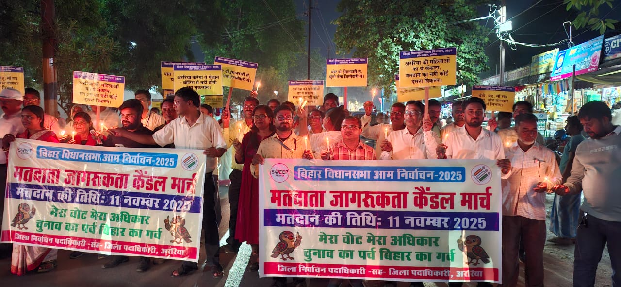 ارریہ :بہار اسمبلی کے عام انتخابات 2025 کے پیش نظر، SVEEP مہم کے ایک حصے کے طور پر SVEEP سیل کی قیادت میں ارریہ ضلع میں ایک ووٹر بیداری کینڈل مارچ کا انعقاد کیا گیا۔