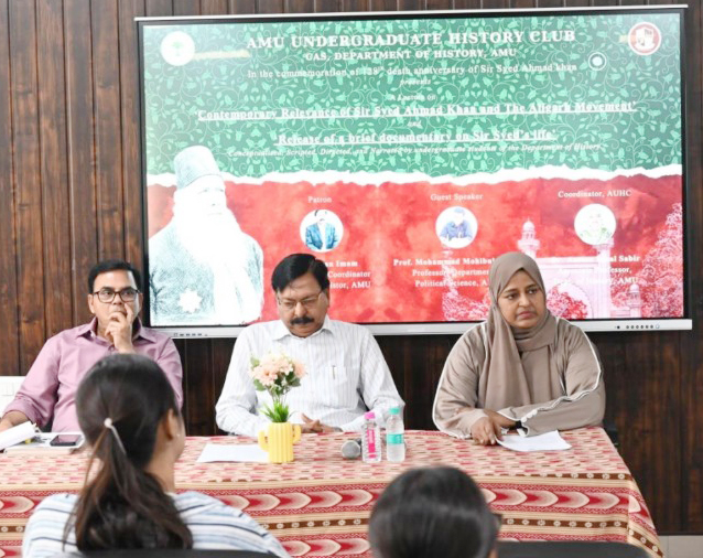 علی گڑھ:علی گڑھ مسلم یونیورسٹی (اے ایم یو) کے انڈرگریجویٹ ہسٹری کلب نے بانیئ درسگاہ سر سید احمد خاں کے یوم وفات کے موقع پر ’سر سید احمد خان اور علی گڑھ تحریک کی عصری اہمیت‘ موضوع پر شعبہ سیاسیات کے پروفیسر محمد محب الحق کے ایک لیکچر کا اہتمام کیا۔پروفیسر محب الحق نے اپنے خطاب میں نوآبادیاتی دور میں ہندوستانی معاشرے، خصوصاً مسلمانوں کو درپیش سماجی، سیاسی اور تعلیمی چیلنجوں سے نمٹنے میں سر سید کے انقلابی کردار کو اجاگر کیا۔ انہوں نے جدید تعلیم و سائنسی فکر کے فروغ اور ادارہ جاتی ترقی کے سلسلہ میں سر سید کی کوششوں پر روشنی ڈالتے ہوئے موجودہ دور میں ان کے افکار کی اہمیت کو بھی واضح کیا۔